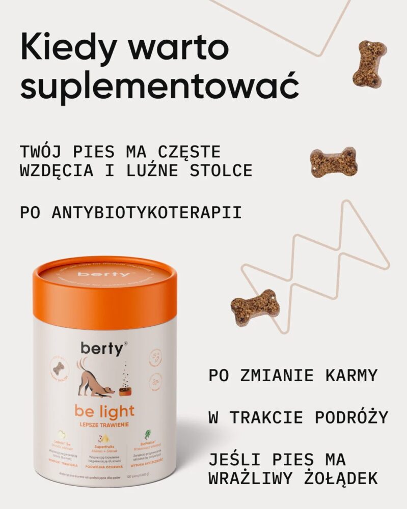 Ciągłe odbijanie, luźne stolce czy nieprzyjemny zapach z pyska to sygnały, że układ pokarmowy Twojego psa potrzebuje wsparcia. Berty Be Light to zaawansowane połączenie naturalnych enzymów, probiotyków i ekstraktów ziołowych. Dzięki technologii Air-Dried, nasze smaczki zachowują pełną moc składników aktywnych, które kompleksowo przywracają równowagę w jelitach i poprawiają komfort życia Twojego pupila.
