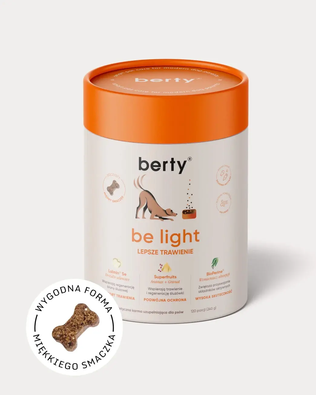 Ciągłe odbijanie, luźne stolce czy nieprzyjemny zapach z pyska to sygnały, że układ pokarmowy Twojego psa potrzebuje wsparcia. Berty Be Light to zaawansowane połączenie naturalnych enzymów, probiotyków i ekstraktów ziołowych. Dzięki technologii Air-Dried, nasze smaczki zachowują pełną moc składników aktywnych, które kompleksowo przywracają równowagę w jelitach i poprawiają komfort życia Twojego pupila.