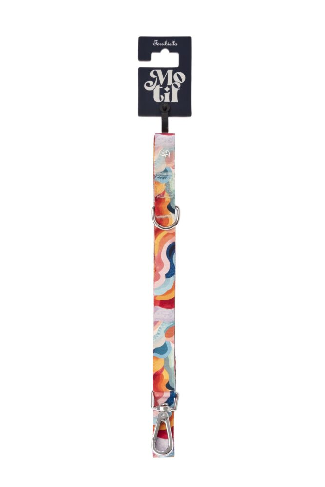 Ten wzór przyciąga spojrzenia. Abstrakcyjne fale w kolorach koralu, turkusu, żółci i granatu tworzą kompozycję pełną energii i lekkości. Srebrne, błyszczące okucia dodają całości elegancji. To smycz, która pasuje do każdej maści psa i… do Twoich najlepszych stylizacji.