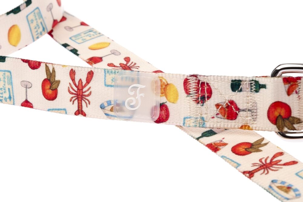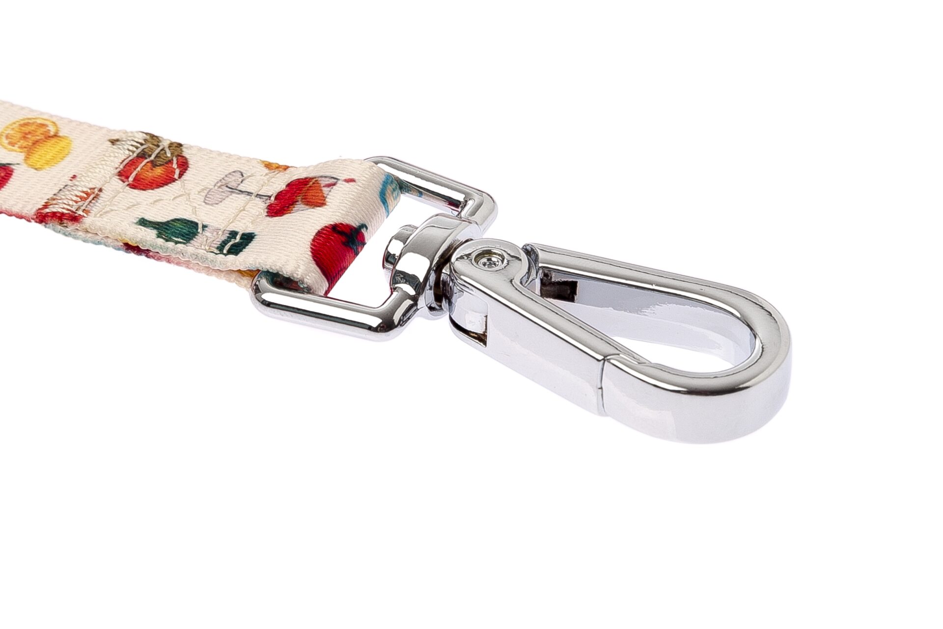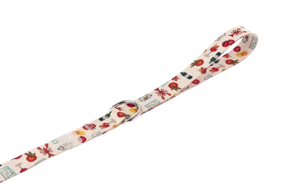 Na kremowym tle tej smyczy dzieje się kulinarna magia. Znajdziesz tu czerwone homary, miski pełne spaghetti, butelki wina, cytryny i soczyste pomidory. Wzór jest gęsty, kolorowy i niesamowicie stylowy. Srebrne, błyszczące okucia dodają całości elegancji. To smycz, która na każdym spacerze będzie przyciągać spojrzenia.