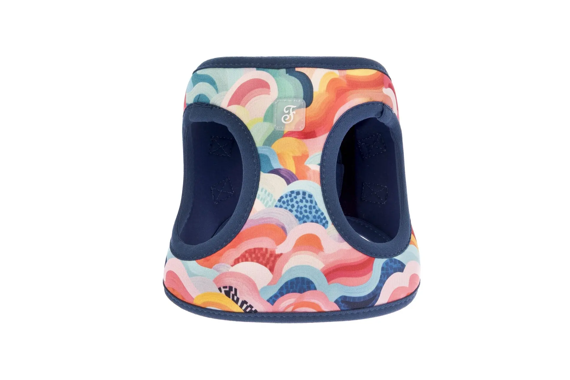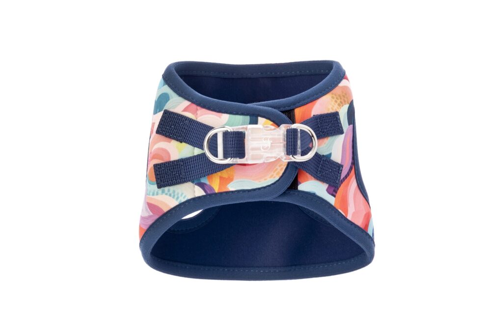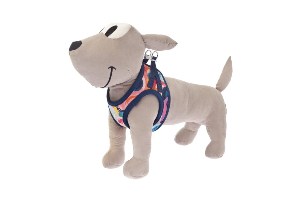 Ten wzór wygląda jak ręcznie malowany obraz. Abstrakcyjne fale i chmurki łączą w sobie energetyczny koral, świeży turkus i słoneczny żółty. Całość została ujarzmiona elegancką, granatową lamówką, która dodaje szelkom szlachetności. To design, który przyciąga wzrok, ale nie przytłacza urody małego psa. Idealny zarówno dla pieska, jak i suczki.