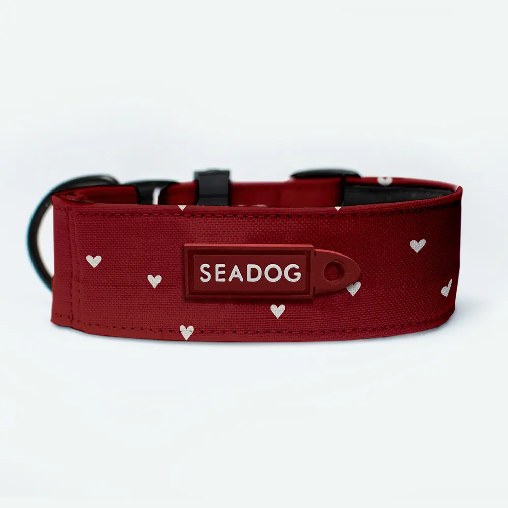 Elegancja charta wymaga odpowiedniej oprawy. Taśma w kolorze głębokiego wina (bordo) usiana beżowymi sercami prezentuje się na smukłej szyi niezwykle dostojnie. To wzór klasyczny, bez zbędnego chaosu, który podkreśla urodę psa, zamiast ją przytłaczać.